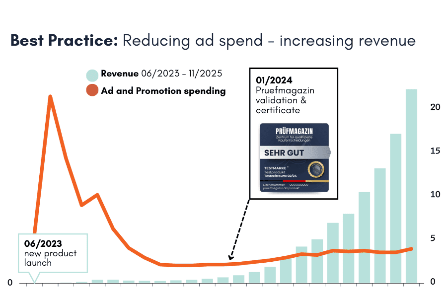 Produktlaunch 06/2023: Hoher initialer Ad-Spend, stagnierende Revenue. Ohne Vertrauenssignale blieb nur bezahlter Traffic.